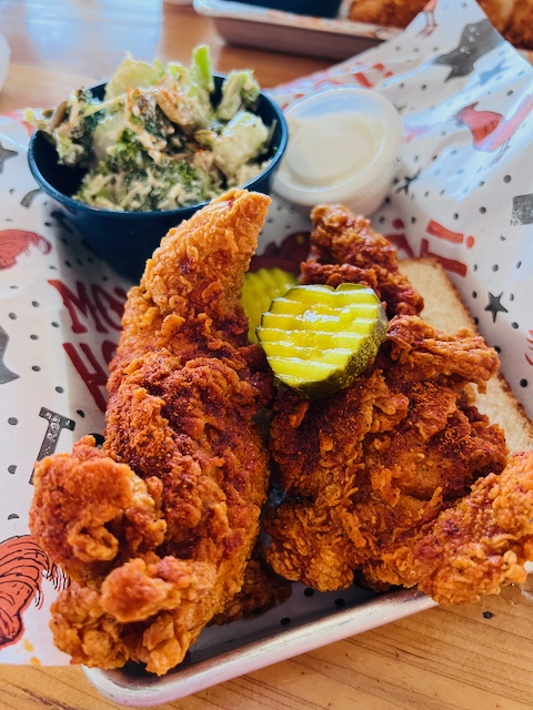 T22 serves food inspired by Nashville-style hot chicken, which means Marmulstein has brought a chef’s eye (and taste buds) to the dish. I’ve never had Nashville-style chicken before Tumble 22, but if it’s as good in its natural habitat as this, I’m all in. The chicken at T22 is perfectly fried, juicy, and delicious. The tumble comes in four heat levels (Wimpy, Hot, Dang Hot!, and Fire in the Hole!! [the menu shows the latter with a chicken emitting flames out of both ends; you’ve been warned!]). For the delicate flowers among us, there are non-spicy choices as well.