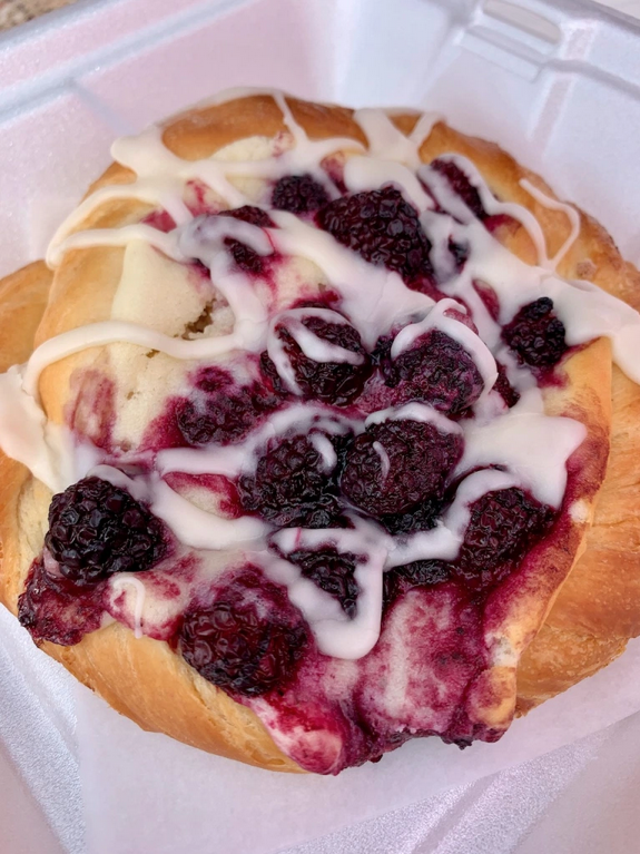 I read a glowing review of the blackberry cream cheese pastry (there are also blueberry, peach, lemon, and raspberry choices), so we picked one up (with another Black Bear) for breakfast later in the week. Again, huge (eminently sharable), gorgeous, and delicious with sweet berries clinging to the richness of the cream cheese like a Russian model clinging to a billionaire.