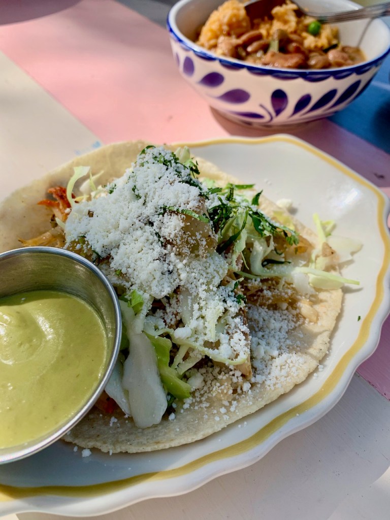 I dove into the namesake taco, La Fresa (pulled achiote chicken, guacamole, cabbage, grilled onion, cotija cheese, cilantro, corn tortilla; $4.5). As beautiful as your abuela’s tablecloth, I found it as fresh as a sunny spring day but with flavors too subtle unless dowsed in the accompanying avocado verde sauce, probably because this taco is meant to be healthy (must. have. grease.).