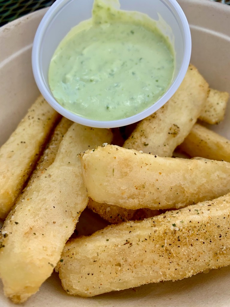 Matt Odam (aka The Second Best Restaurant Reviewer in Austin) raved about the Pulled Jackfruit Sandwich (barbecue style, pickles, and jerk slaw; $9), and rightly so. He noted that it’s better than most pulled pork sandwiches in town, and I’m not sure I coulda told you that it didn’t have pork in it given the tasty tang of the sauce and stringy texture of the jackfruit. The Cuban Yucca Fries (with jalapeno avocado dip; $7) I ordered with my ‘wich were outstanding, the best we’ve ever had: crunchy and salted on the outside and soft and aromatic on the inside. They are on our order-every-time list.