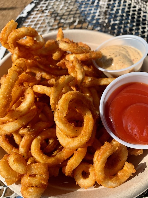 The menu is not deep, but it’s thoughtful, offering traditional bar food while adding tropical twists and turns. While the bar food is traditional, the preparation and ingredients show a chef’s touch. I guarantee that “The Burger” (cheese, lettuce, tomato, onion, and mayo; $10) is the best 10-buck burger you can get in town with lip-smacking beef-forward flavor. The Curly Fries with two side sauces ($7) were perfectly golden-crisped and piled high enough to feed The Clash.