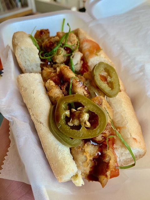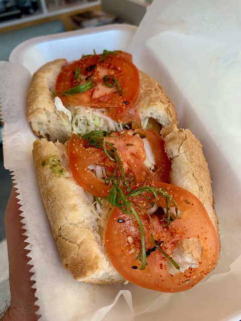 The pandemic has been hard on restaurants, especially intimate ones like dipdipdip shabu shabu where the next table is right next to you. In response, dipdipdip has turned into a sandwich dipping pop-up called, appropriately enough, dipdipdip pop-up. The dipdipdip pop-up offers beef (24-hour Texas Wagyu, wasabi ranch, garden pickles, and sweet-n-spicy chowchow, with umami jus dipping sauce; $12.75), chicken karaage (with kosho lime mayo, smoked jalapeno pickel, tomato, and tankatsu; $9.75), shrimp tempura (with cabbage, avocado, tomato, tonkatsu sauce, spicy mayo, and negri with spicy miso dipping sauce; $13.75), and veggie (pimento cheese, charred broccolini, pickled green tomatoes, and sunflower sprouts with spicy mayo dipping sauce; $10.75) sandwiches with a daily special (that may or may not be a sandwich). For sides, they offer the Pow!tato (crispy smashed potatoes with nori furitake; $3.5)) and a summer melon salad (melons, red onion, sweet rice vinegar, soy, yukari, mint, and lemon zest; $3.5).
