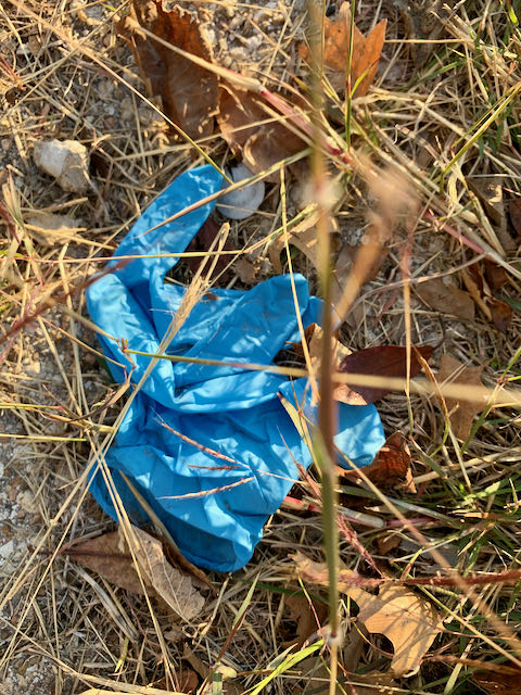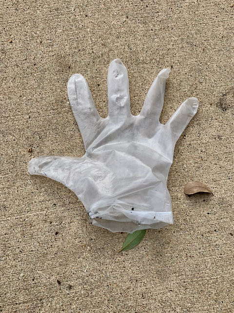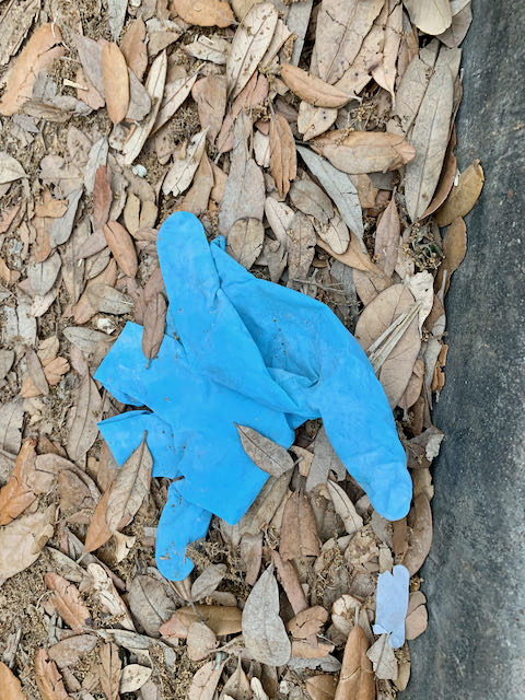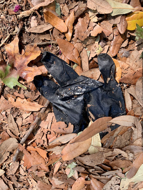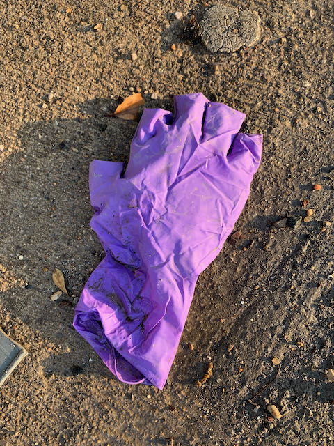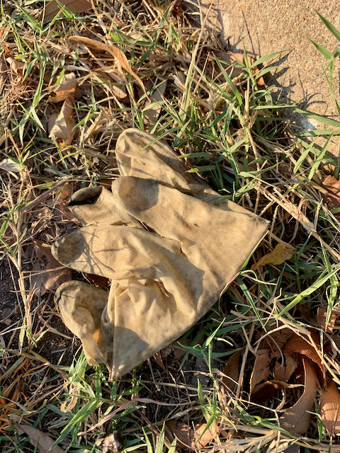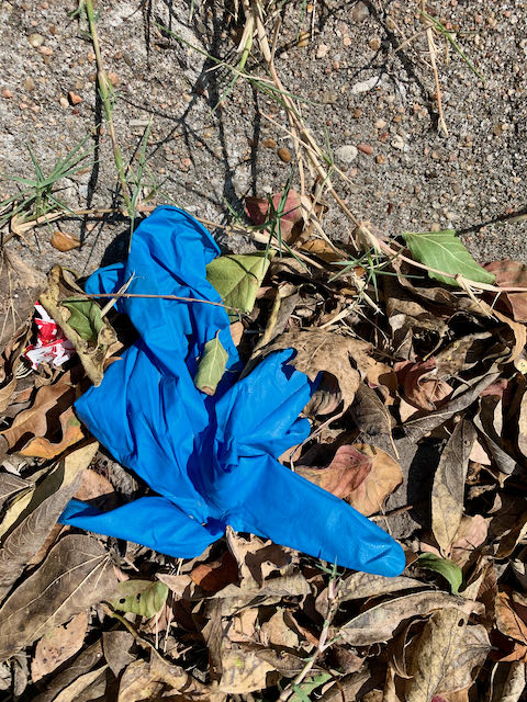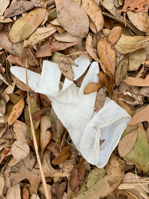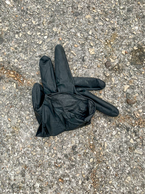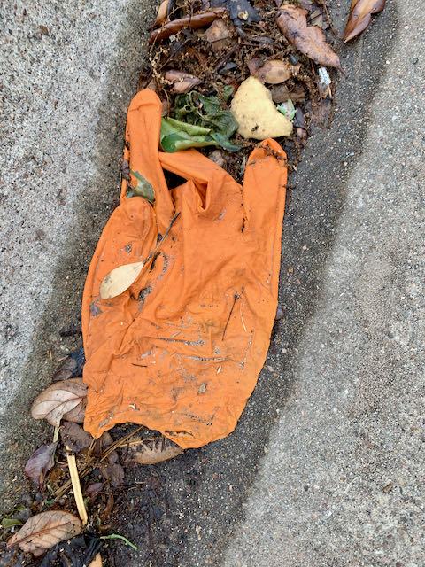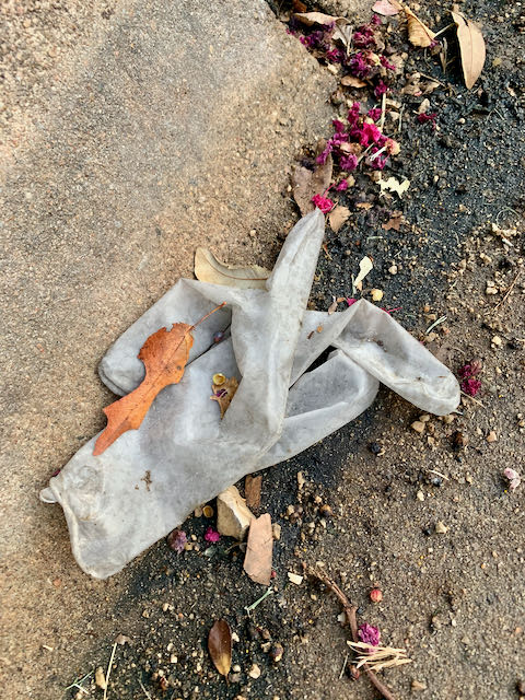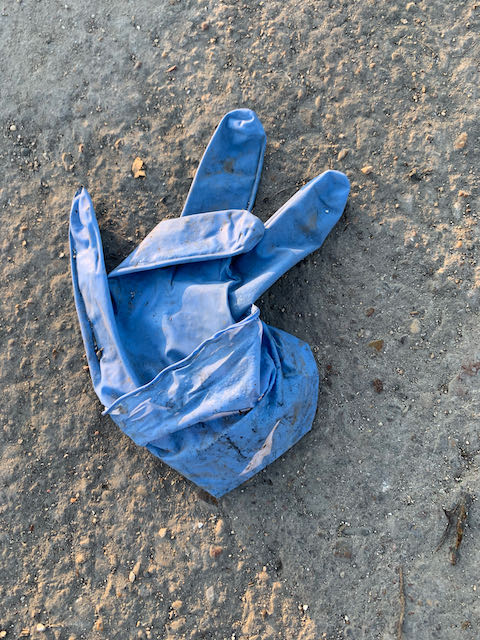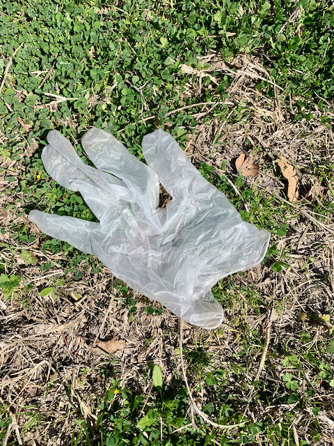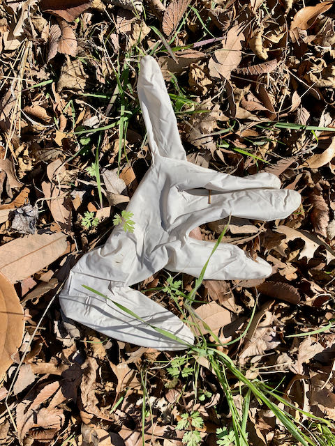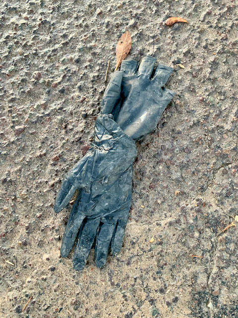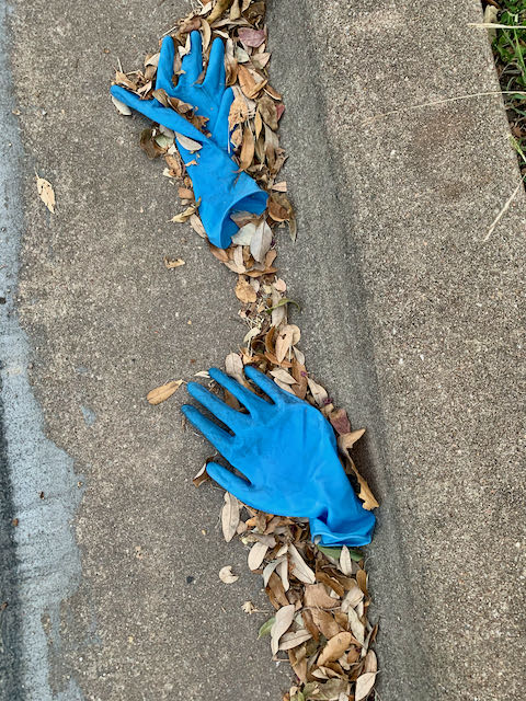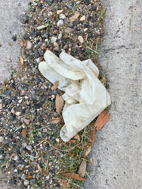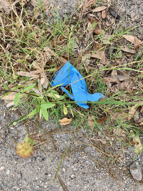 Similar to discarded masks, I find gloves interesting because discarded gloves speak of discarded humanity. Although mostly blue, the gloves have a variety of colors, including an orange one that somehow seemed to be rah’ing the Longhorns. The gloves I found had mostly lost their mates, but some I found together. Some gloves look like discarded condoms.