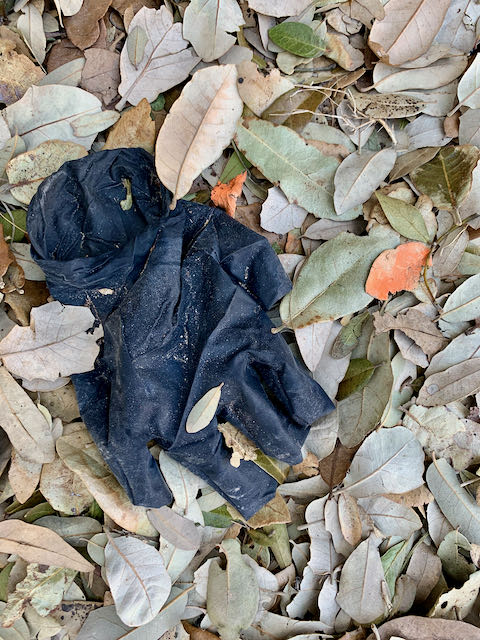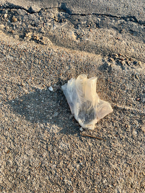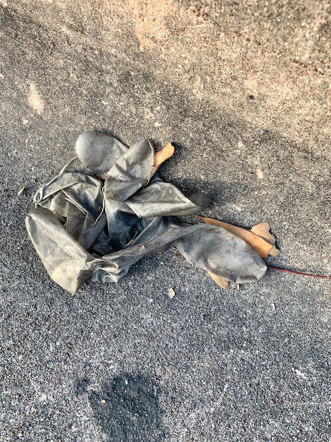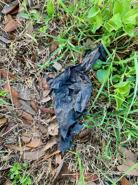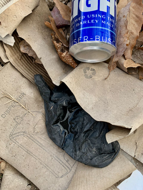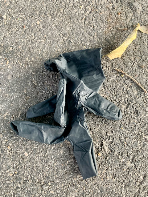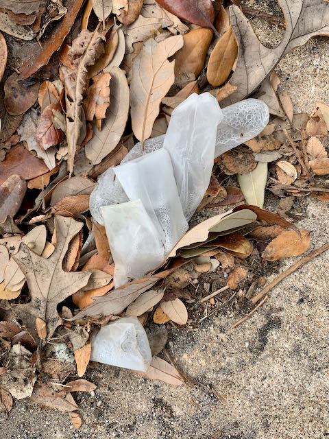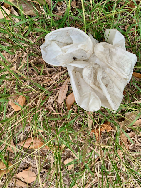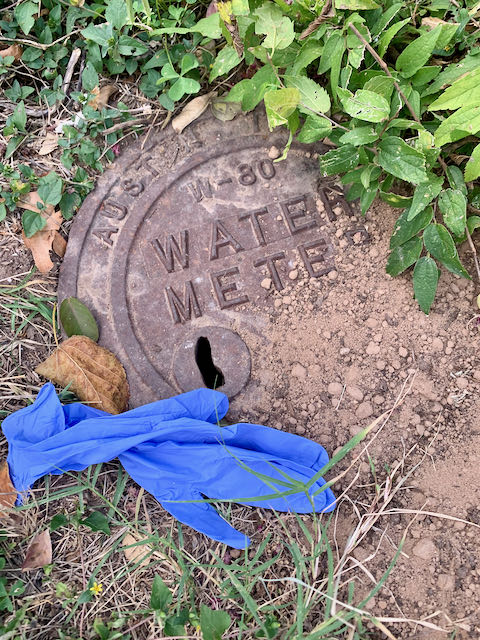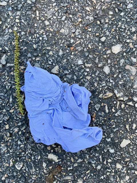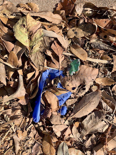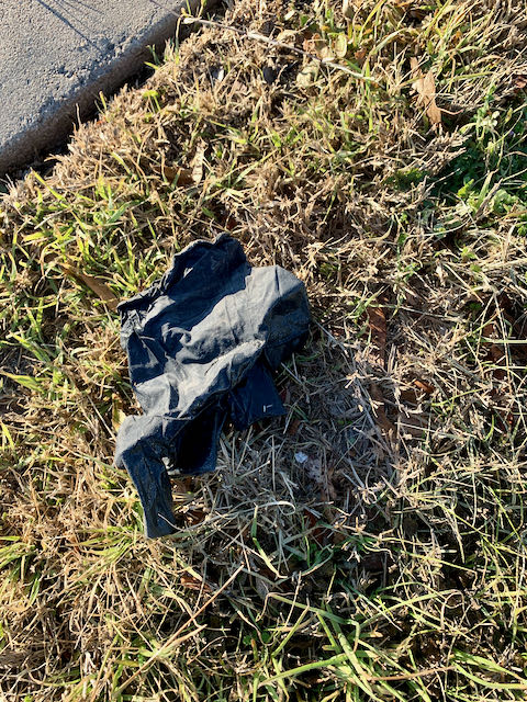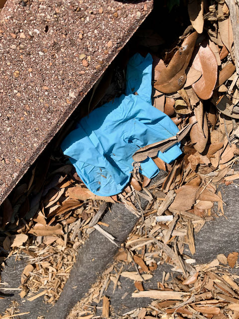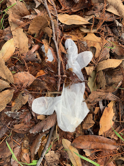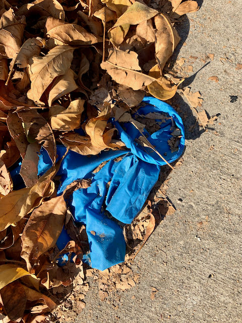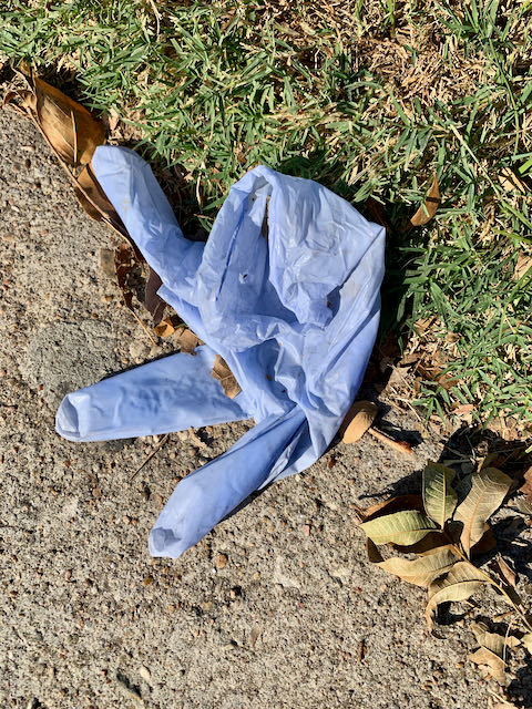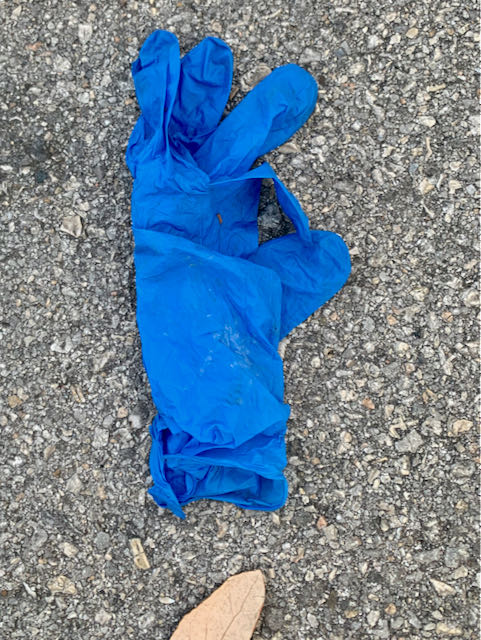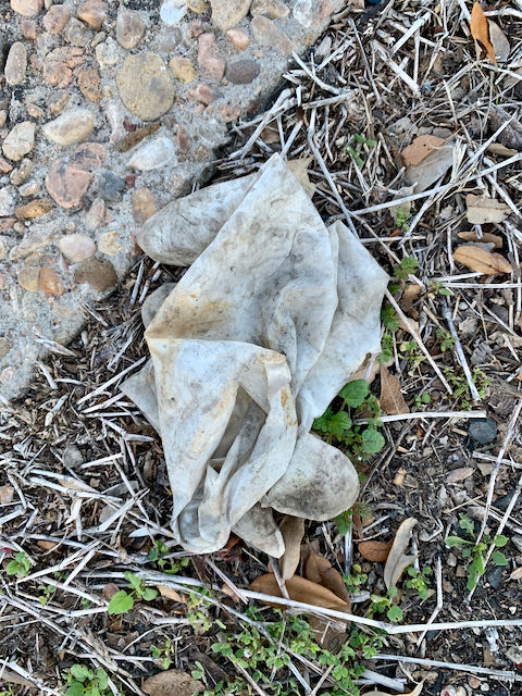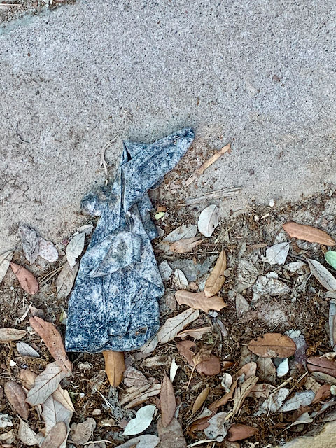 Similar to discarded masks, I find gloves interesting because discarded gloves speak of discarded humanity. Although mostly blue, the gloves have a variety of colors, including an orange one that somehow seemed to be rah’ing the Longhorns. The gloves I found had mostly lost their mates, but some I found together. Some gloves look like discarded condoms.