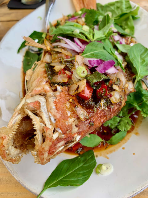 Thai-Kun recommends that diners eat dishes family style since the dishes come out as soon they are prepared, and so we did, following the Chive Cake with the fish special, a red snapper with chili tamarind sauce ($70). The fish comes whole, battered and fried, and adorned with an aromatic medley of onions, peppers, and basil. Someone walking onto the patio stopped, gawked, and announced “That looks amazing!” And so it was: The delicate flakes of fish with sauce-soaked batter ladled with caramelized onions and peppers plucked with fresh scallions and basil on jasmine rice left us picking the bones like starving alley cats.