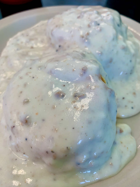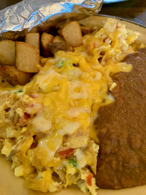 I ordered the Double Trouble (two eggs, two sausage patties, two strips of bacon, two biscuits with sausage gravy and home fries; $11) while The Bride went with her old ordering stand-by, Migas (two eggs scrambled with sauteed onions, cilantro, jalapenos, tomato, and tortilla strips topped with cheese and served with home fries, refried beans, and flour tortillas; $9.8). As you might imagine, we needed a box. What can I say about the food except that the plates met our expectations.