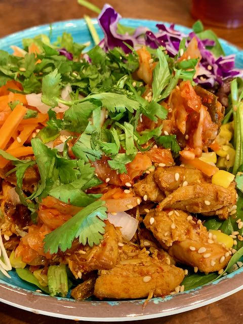 Ordering can be a little daunting since there are many choices. Although not shown on their on-line menu, the storefront includes a “Signature” bowl and ssäm, which is a good place to start. A Signature bowl or ssäm runs about $10, but you still have to choose a base (jasmine rice, brown rice, japchae noodles, lettuce and cabbage, spinach, or fries), a protein (Korean BBQ Angus steak, spicy chicken, soy glazed chicken, or marinated tofu), and sauce (carrot ginger, lime juice, sesame vinaigrette, magic sauce, spicy ranch, salsa roja, and sriracha). Standard ingredients include black beans, grilled corn, green leaf lettuce mix, carrot, red cabbage, kimchi, onion, cilantro, and sesame seeds). A small ssäm (a small taco) goes for $3.50 each.