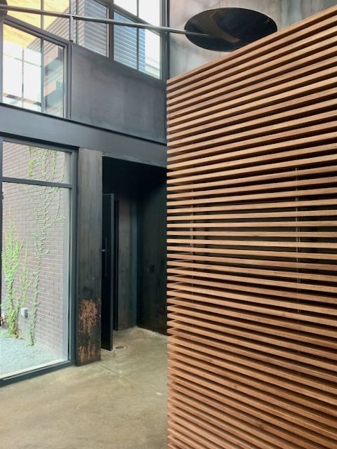 Kundig is famous for his human-scaled minimalist steampunk aesthetic where each building has some interactive mechanical feature. In this space, it is the large wheels used to open and close patio doors thresholding the indoor-outdoor space. The architecture subtly lets you know through brick, steel, concrete, and glass that while there’s a solid foundation in tradition and history here, there’s also a nod to today and the future. Call it steam-punk Mexican.