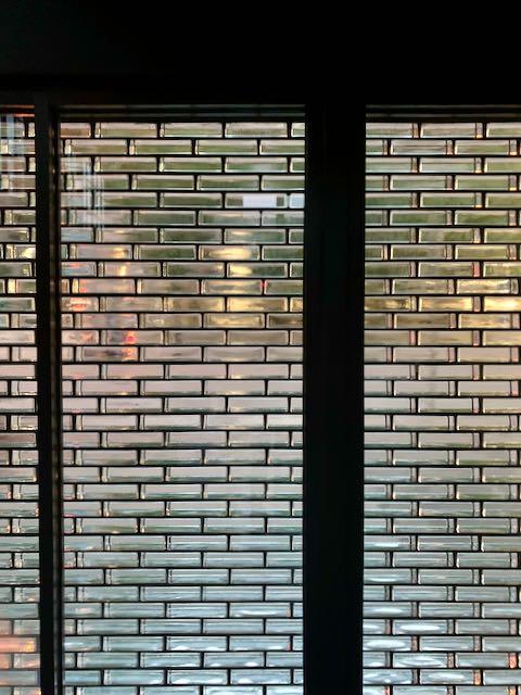 You enter a dark, compressed, Wrightian, low-ceilinged space to speak with the hostess before entering an explosion of light and height with sunshine, 32-foot ceilings, and a courtyard to the sky. Once inside, you realize that what you thought were glazed bricks on the outside are actually made of glass, allowing ample ambient light to filter through the walls.