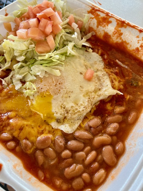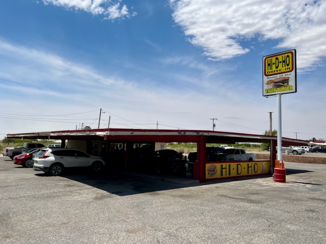 Located on the southern end of White Sands Boulevard, the Hi-D-Ho Drive-In is low slung with long arms that cantilever over the cars parked to partake of the wares. There are tables to eat outside and a few inside (but indoor seating is still out of commission due to covid), but you can also order and eat from your care under the wings (flash your lights for care service). The service was friendly, attentive, and artfully tatted.