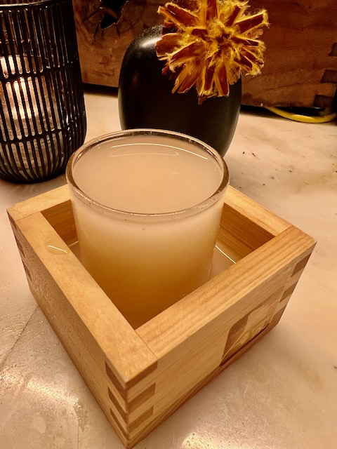 We started with a couple drinks, she with a takara nigori (unfiltered sake, $5.5HH) and me with a murasakino (lemongrass sake, blueberry, and makrut; $9HH). Hers came in a small glass sitting in a small bamboo box where the overpour flows into the box (and you can drink out of it). Mine was fruity and happy.