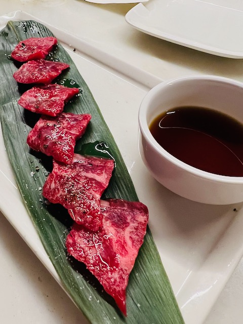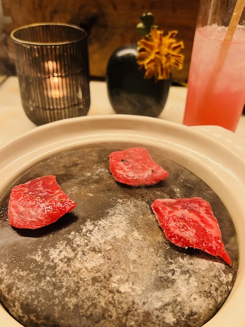 Being part geologist, I had to try the hot rock flank, which I also had at the soft opening. With this dish, out comes a hot rock up on which you cook little pieces of beef. The rock this time was ceramic whereas earlier it was actual rocks, but even then I wondered how long those rocks would hold up with the temperature differentials (and the potential for shardy explosions). Regardless, the dish still brought a smile to my face. I imagine those who grouse about self-checkouts wouldn’t like it (“I paid $18.50 to cook my own damn food!”).