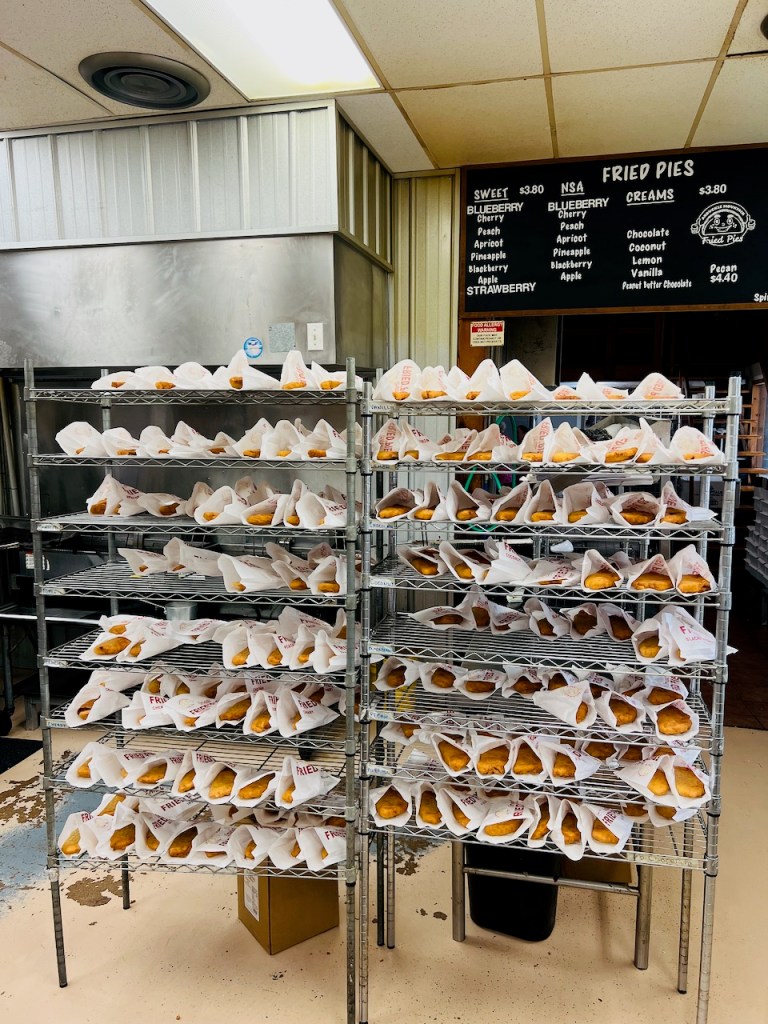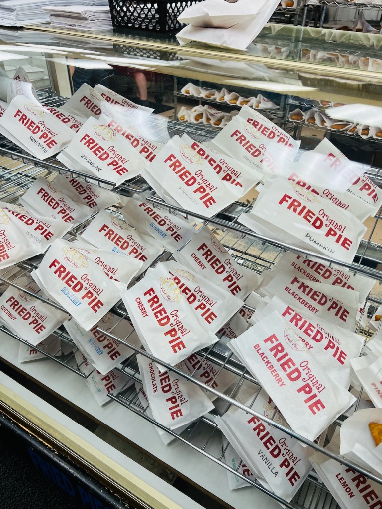 The family has been making fried pies since 1954 from, you guessed it, mom’s recipe. Initially a steak house with fried pies on the menu for dessert, the pies took over, and that is all that is sold here today. The place is out in the middle of nowhere but conveniently located next to I-35 (the pies were there first). I got into line and ordered a fruit pie, a savory pie, and a fruit to go. I noticed later that a freezer on the side held frozen pies.