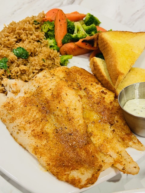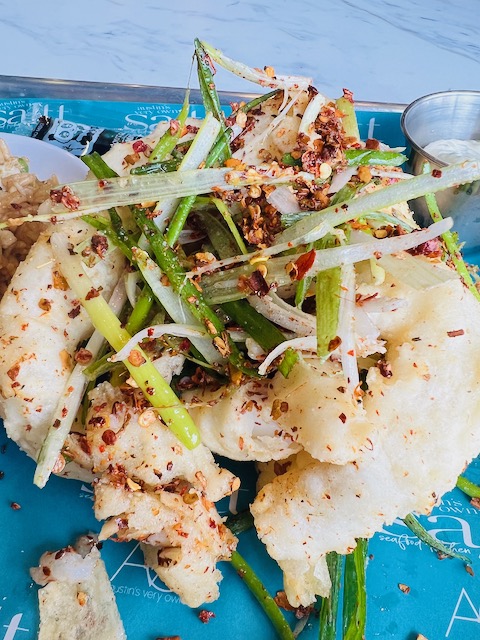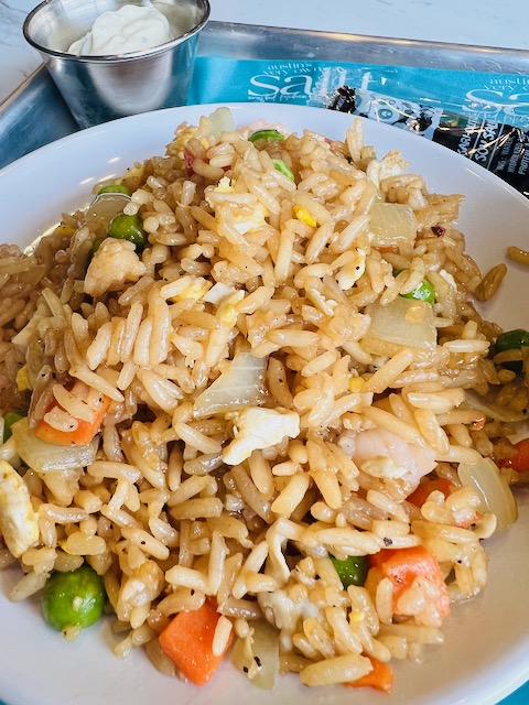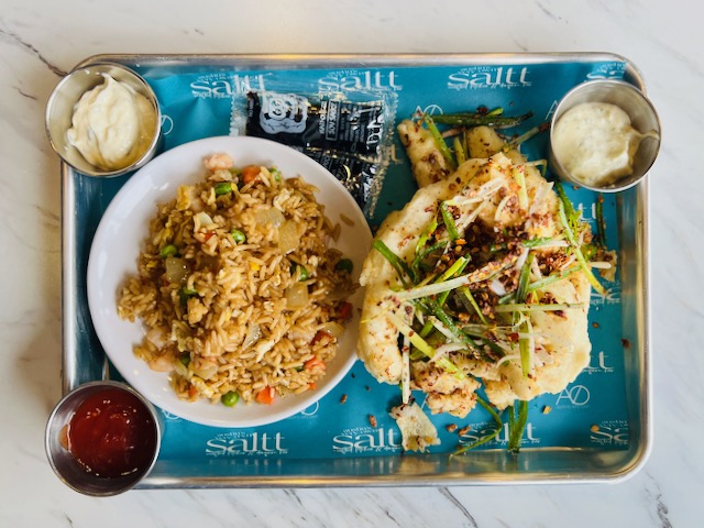Similar to Bruce’s (based on Yelp reviews), it can take a bit (15 to 20 minutes or more) for your food to arrive (“not-too-fast casual”). That’s because your food is made fresh. Everything we’ve ordered has been impeccably prepared and delicious. My fave is what I ordered on my first visit, the Salt & Pepper Catfish Strips (with shrimp fried rice or fries, $16). Again, that pile of pepper flake and onion ribbons with fried fish is perfection, a delectable fusion of Asian and Cajun cuisines. All the dipping sauces were good, but the jalapeno ranch dressing was particularly special. The Bride tried the Grilled Catfish (with rice and steamed veggies; $16) and I did the same but with shrimp ($16). Both were, again, perfectly prepared with an amazing side of al dente rice.