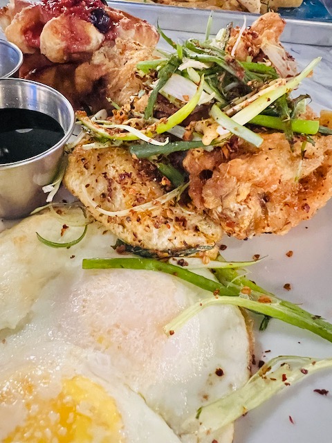 Saltt has several brunch items on the menu that are available all week and all day. I plowed through the truck-driver worthy Salt & Pepper Chicken and Waffles (4 wings, 1 waffle, 2 eggs, 2 pieces of bacon, and grits; $20). The waffle crunched with slight sweetness while the robust cherry marmalade canceled the need for syrup complemented with the phalanx of savory choices across the rest of the plating field. The only miss was the Boudin Balls (3 for $8)—perfectly fried but with an oddly low-to-no-flavor sausage inside.