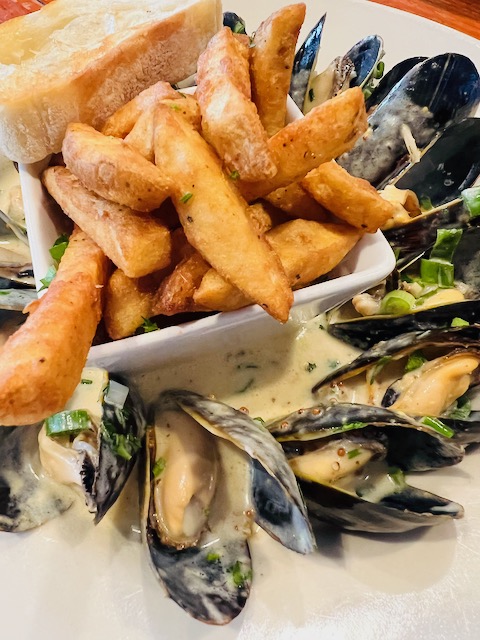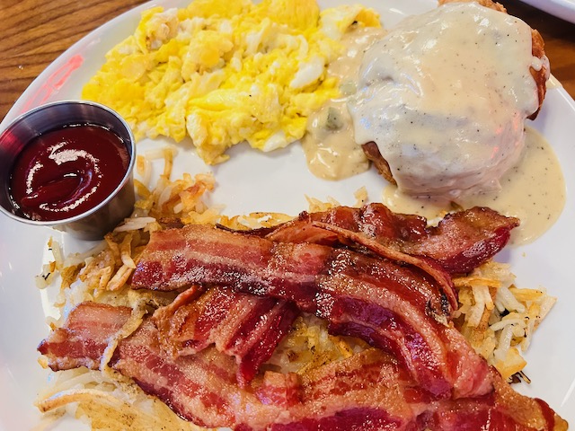 The waitress stops back by and drops a teepee of a bill and asks if I want more iced tea. “What I really need is half a glass of milk.” She disappears and then reappears with the milk. “You can add it to the bill,” I say as she walks away. She smiles. “It’s on the house.”