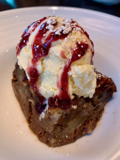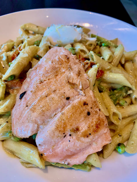 A few years back (keep that in mind on the quoted prices), The Bride and I did the Full Monte with drinks, entrees, and dessert. She ordered a Lavender Daydreams (Western Son Cucumber Vodka, gin, Creme de Violette, lemon juice, simple syrup; $10) while I partook of the Chicago Typewriter (Bulleit Rye, grapefruit, sage simple syrup, citrus bitters, and egg-white froth; $12), a drink that sounded ominously like a Columbian Necktie. Both drinks were gorgeous and good. We both stayed on the healthy side of the menu with straight-up salmon ($24) and Pesto Penne ($16) with salmon added ($8), both delicious. Although we didn’t need it, we ordered the Guinness Bread Pudding ($9.5). I like Guinness, I like bread pudding, I like Guinness Bread Pudding.