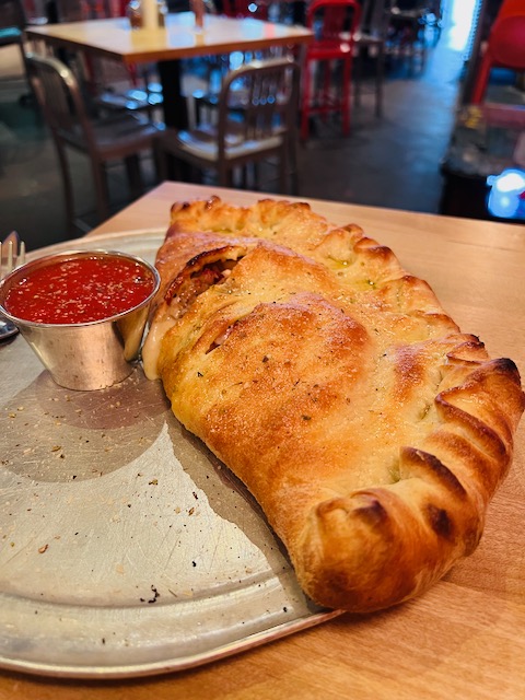 I’ve only ever ordered the slice, salad, and sip ($11), but I see, after gawking over their full menu, there are other options, including calzones ($10 to 12), Slice and Pint ($7, although the last thing I need at lunch is a beer…[but you can order up to 6 pm!]), a Meatball Sandwich ($9 to 13), and various salads ($5 to 14+). And, of course, full pies, including The Garden of Eden, El Diablo, The 78-666, The Tempeh of Doom, and The San Martian. You can also get a baked egg plopped on top of your pie ($2). They also have vegan options, including for the cheese.
