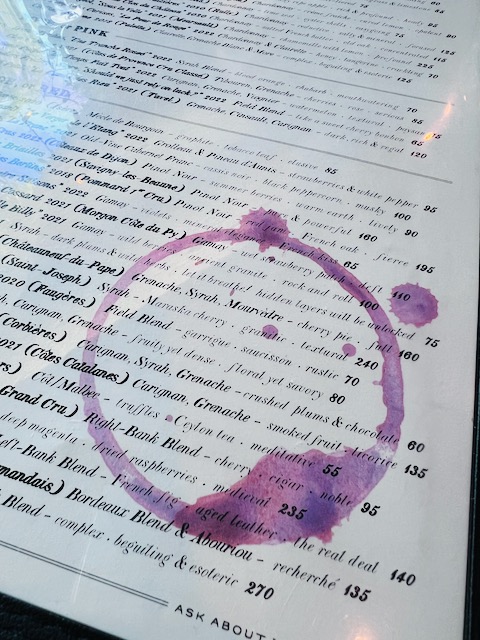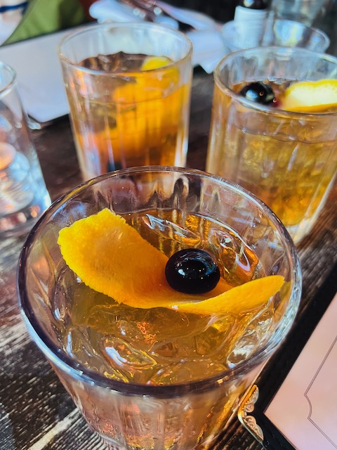 The bevs came in glass tumblers; clear, chipped ice; and Luxardo cherries and orange peels. Since they have Angostura bitters in other drinks, I suspect that is the bitt we bit. For the whiskey, I’m 90% sure they used Armorik, a French single malt.