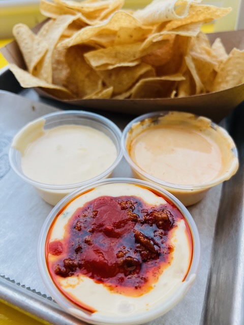 The secret ingredient in Kesos Tacos is in the name: each taco includes queso, either the house queso, queso with chorizo and fire red salsa, and the queso of the month. You can even order a queso flight if that’s your thing (it’s undoubtedly mine…). The menu splits between breakfast tacos and lunch and dinner tacos, but Kesos serves them both all day, a big plus for my tumtum. As promised, every one of their 27 tacos says “topped with queso” (I checked). There are tacos with beef, chicken, shrimp, tilapia, and pork and a few veggie choices. You also have your choice of five salsas: avocado, roasted red, jalapeno, fire red, and habanero. In addition to the standard bevs, you can get beer, a ranch water, or margaritas.