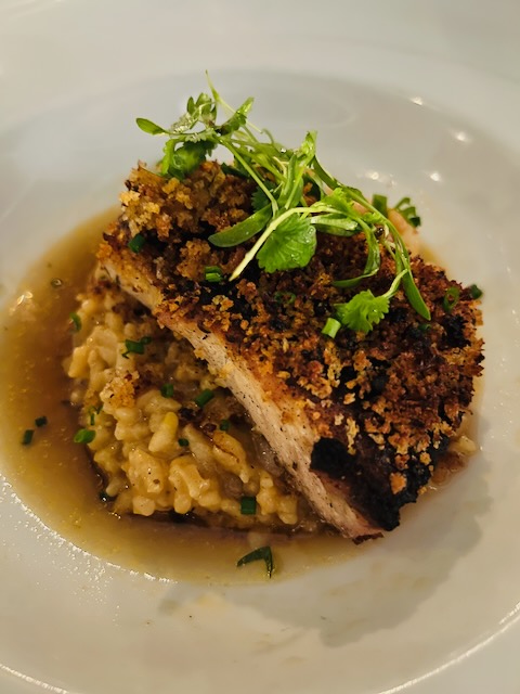 We started with the salmon crudo ($23) which arrived speckled with pomegranate seeds and swimming in citrus sauce. Light and festive, the dish was a refreshing way to start the meal. For mains, The Bride ordered the Florida Black Grouper (with trinity [onions, carrots, and celery] and charred maque choux apple brandy; $41) while I tried the Red Fish (with andouille crust, bomba rice, and shrimp-lobster consomme; $38). Both dishes were amazing with crispy skins, soft pillows of fish, all haloed above a foundation of veggies, rice, and demiglace. For dessert, after learning the Key Lime Pie had run dry, we went with the Heath Bar Butterscotch Bread Pudding with cayenne whipped cream ($10). The bread pudding was delicious, but the combo sweet-hot of cayenne in the whipped cream was epically good.