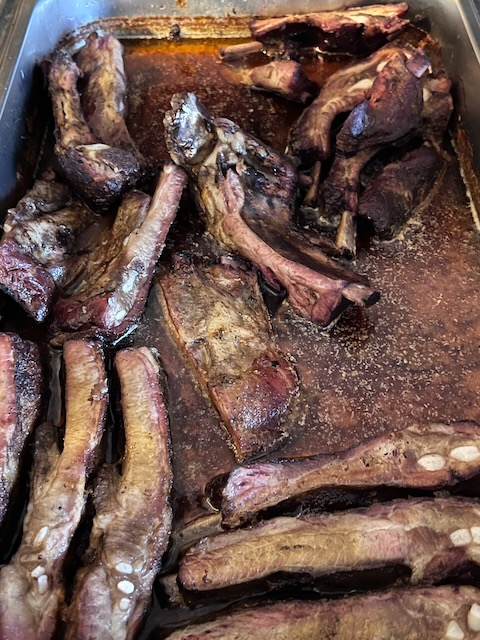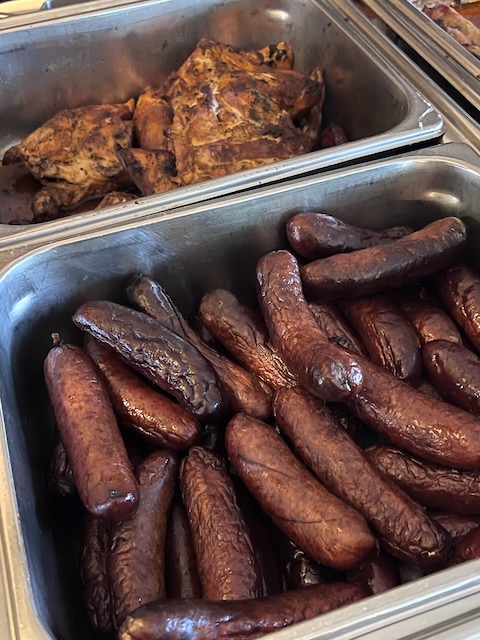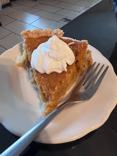 Oh my, was the food downhome good! The rib and chicken were pull-off-bone tender and tasty. The catfish was perfectly corn crunchy on the outside and pillowy soft and warm on the inside. And the sausage, clearly fresh and housemade (or housemade by someone in town?) was savory with a thin, crunchy skin. My seatmate tried the banana pudding ($4.5) while I couldn’t resist the sweet potato pie ($3.5), both delicious.