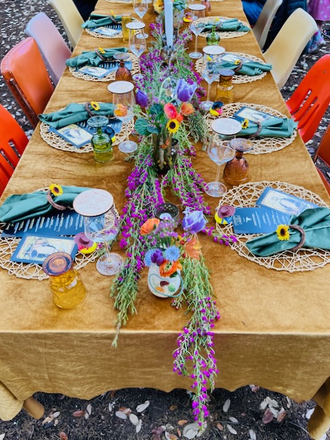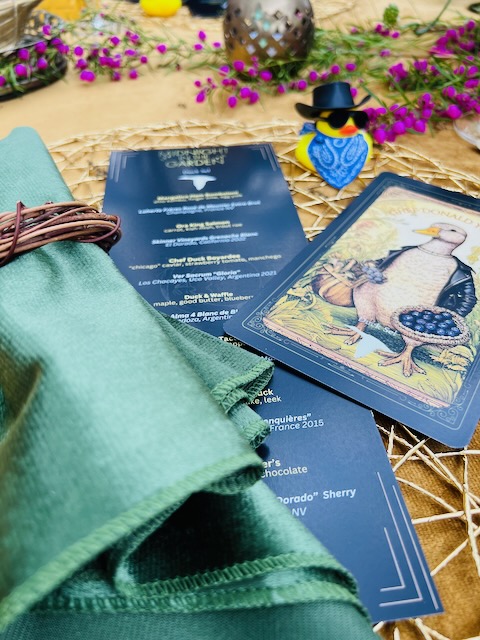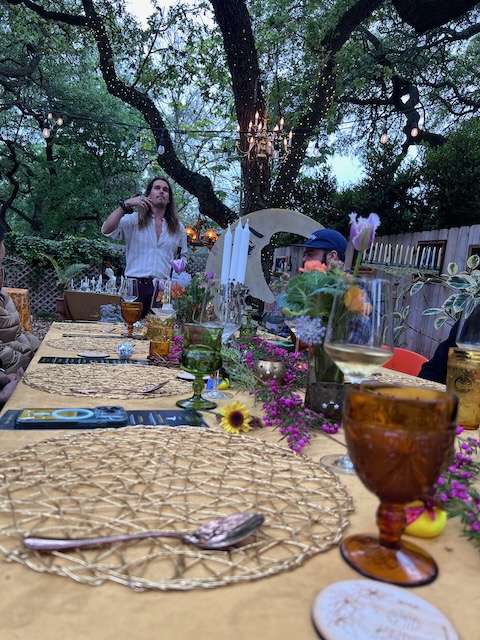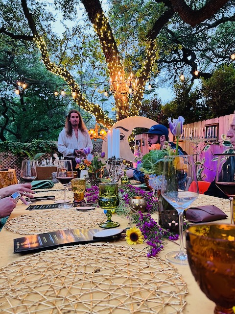 Each seating has 24 spots with a long, community table, so you meet folks on either side of you, foodies all, of course. While you do not see a menu when you sign up, a full (and professionally printed) menu awaits you at your seat along with a keepsake tarot card honoring the chef. The vibe is Austin from 20 years ago when grassroots culture defined the city instead of the scraped homes and AudiTeslaBMWs of today.