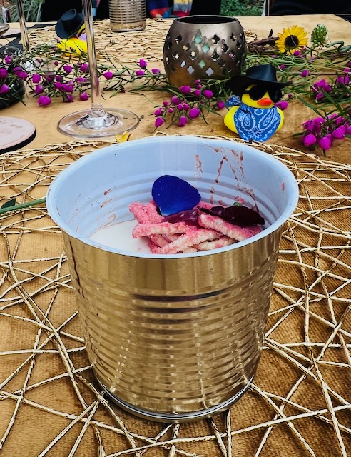 The food was crazily inventive and delicious (and there was much more to it than indicated on the evening’s menu). There was a lot of sweet and savory simply crazy. For example, the Chef Duck Boyardee arrived in a tin can with, bottom-up, a duck meatball (wow), noodles, and crispy top, and candied stuff. The Duck & Waffle had the most amazing duck butter to dab on the waffle. The King Salmon was prepared in a way that turned the salmon into something like butter. The main course duck was perfectly prepared with the most savory of rubs. As a bonus, the chef sent us home with a tres leches/cereal treat for the morning.