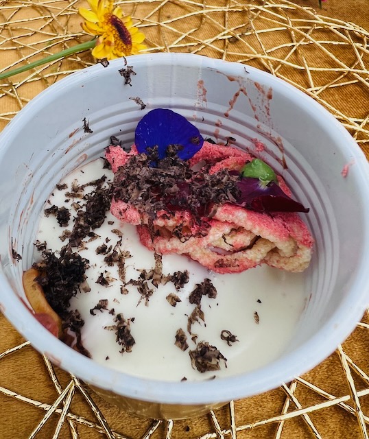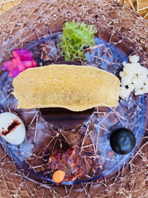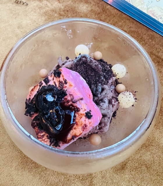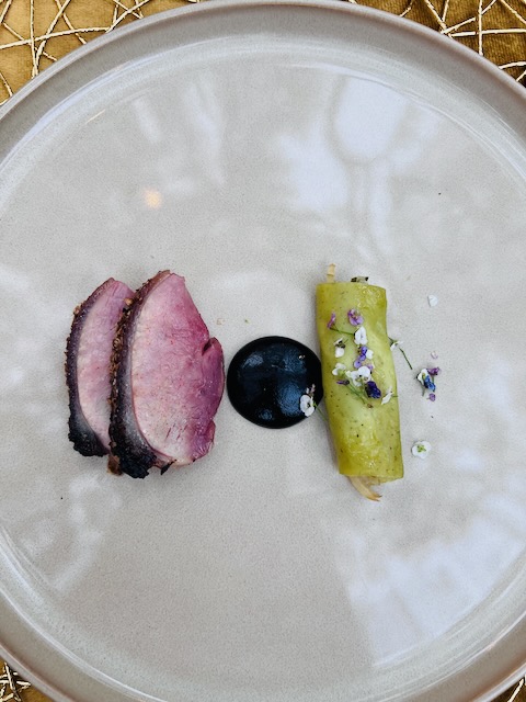 The menu was phenomenal with Mangalica Ham Bombolini (shio kombu, finger lime, egg yolk [paired with Laherte Frères Rosé de Meunier Extra Brut]), Ora King Salmon (carrot, kish mish, trout roe [paired with Skinner Vineyards Grenache Blanc 2022]), Chef Duck Boyardee (“Chicago” caviar, strawberry tomato, manchego [Ver Sacrum “Gloria” 2021]), Duck & Waffle (maple, good butter, blueberries [paired with Alma 4 Blanc de Blanc 2020]), White People Taco Night (dry aged beef, pineapple, corn [paired with Calabretta Vigne Vecchie Nerello Mascalese]), Dry Aged “Peking” Duck (concord hoisin, pancake, leek [Mas Cal Demoura “Terre de Jonquières” 2015]), and Memories of Culver’s (“reeses”, cookie dough, chocolate [paired with Bodegas César Florido Moscatel “Dorado” Sherry]).