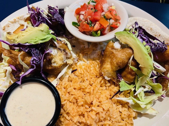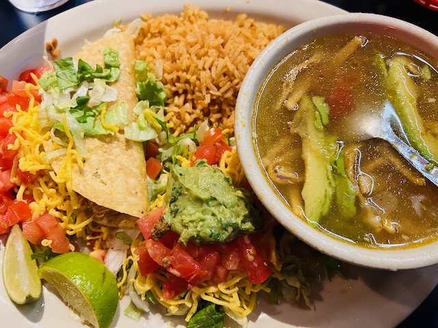 Our faves include the chicken quesadillas ($16, but enough for two), fish tacos (two grilled or fried tilapia tacos with shredded cabbage, chipotle ranch, and fresh lime plus rice and beans; $17), and tortilla soup (chicken soup with tortillas strips, cheese, avocado, and rice; $10). The chips and salsa are dang good as are the margaritas (a recent mescal-arita was delightfully smoky). The chicken fajitas are darn good as well.