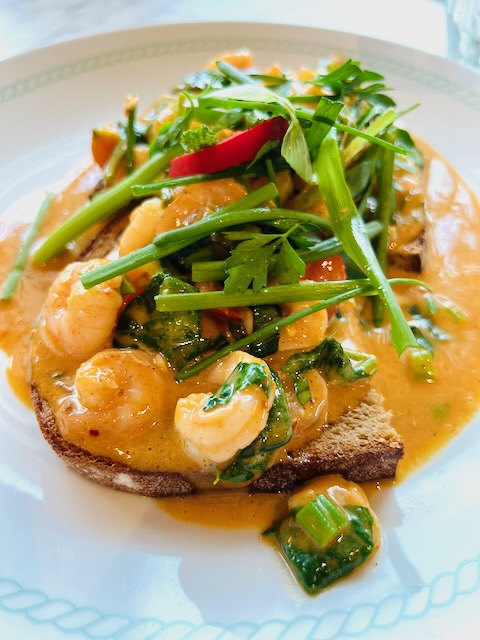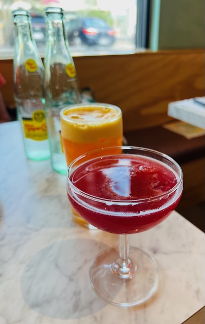 Citizens offers brunches until 4pm upon which the place closes and then reopens at 6pm for the “all day” part. Our first visit was promising. To start things off, I enjoyed the tasty Blueberry Jam Sour (Hendricks or Titos [I Tito’d], Aperol, blueberry, compote, orange bitters, lemon, and egg white; $13) while The Bride imbibed a Golden Hour (whipped orange juice, Tito’s, and Aperol; $14). Both were divine with The Bride describing hers as an Adult Orange Julius [circa 1983 mall culture]). For an appetizer, we devoured the Spicy Shrimp Toast (grilled shrimp, Cajun chili butter, green onion, sourdough; $15). This shrimp-on-the-barbie dish was Deelightful and had me begging for a piece of sopping bread (it was all for research my dear etiquetticians).