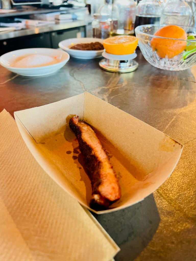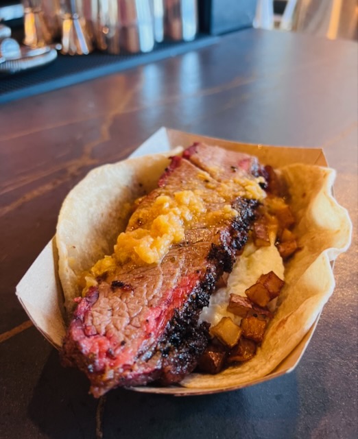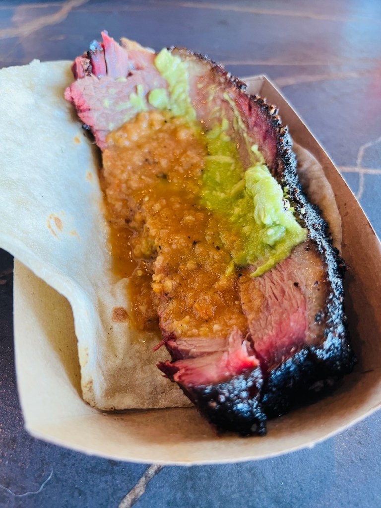 With Vidal at the pulpit, the food is truly biblical. The brisket is tooth-tender, smoky-savory, and righteously deployed in many dishes. La Valentina Taco (homemade flour tortilla, sliced or chopped brisket [I went sliced], guacamole, and fire-roasted salsa; $10.5) is a confessional of flavor and a damn fine taco. The Brisket Smash Burger (two brisket patties, American cheese, grilled onion, mo money sauce, and challah bun; $15; add fries for $2) carries the spirit of Black Gold’s phenomenal version forward. If you’re lucky, the Holy Roller will be available as the special: one rib, quarter pound brisket, half sausage link, and a quarter pound pulled pork, all for only $25 (and easily two meals).