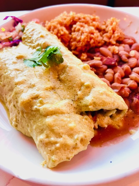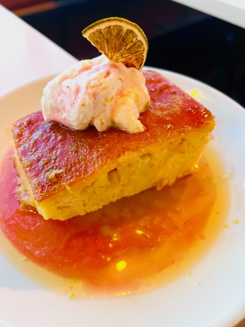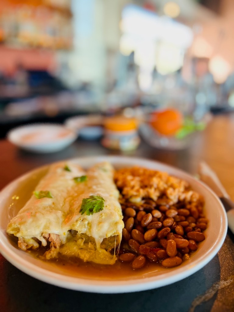 Since The Bride won’t eat pigs and cows (but will eat dinosaurs), we tried the Chile Verde Enchiladas (roasted chicken, tomatillo avocado crema, Mexican rice, and borracho beans; $18). Wrapped in thick, corn tortillas and full of roasted chicken, these are amazing and unlike any other enchiladas we’ve had in town (does Vidal keep his abuela back there rolling tortillas?). I prayed that Vidal would bring back the Real Deal Holyfield (refried beans, potato, bacon, slice of brisket, fried egg, and gangster salsa; $14), a classic from Valentina’s, and there it is, but only for brunch on the weekends. It deserves a spot on the next Texas Monthly Top 50 Taco List. The Bride raved about the Raspberry Corn Cake (fresh mashed corn batter, smoked raspberry sauce, and cream cheese whipped cream; $11) for its emphasis on masa rather than sweetness.